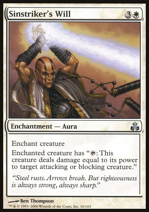 Enchant creature Enchanted creature has "{T}: This creature deals damage equal to its power to target attacking or blocking creature."