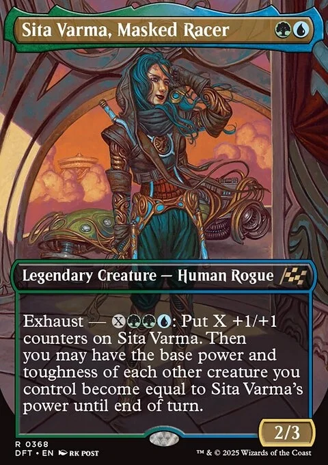 Exhaust — {X}{G}{G}{U}: Put X +1/+1 counters on Sita Varma. Then you may have the base power and toughness of each other creature you control become equal to Sita Varma's power until end of turn. (Activate each exhaust ability only once.)