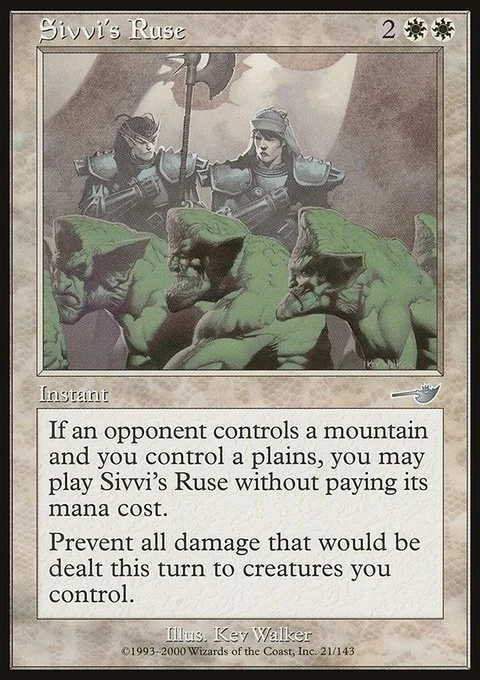 If an opponent controls a Mountain and you control a Plains, you may cast this spell without paying its mana cost. Prevent all damage that would be dealt this turn to creatures you control.