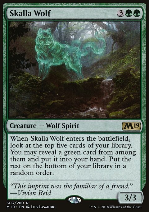 When Skalla Wolf enters the battlefield, look at the top five cards of your library. You may reveal a green card from among them and put it into your hand. Put the rest on the bottom of your library in a random order.