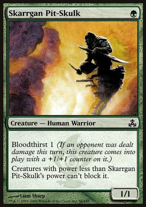 Bloodthirst 1 (If an opponent was dealt damage this turn, this creature enters with a +1/+1 counter on it.) Creatures with power less than Skarrgan Pit-Skulk's power can't block it.