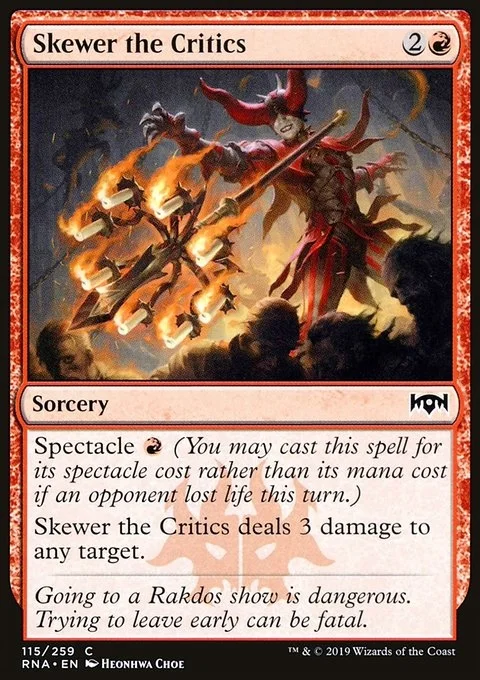 Spectacle {R} (You may cast this spell for its spectacle cost rather than its mana cost if an opponent lost life this turn.) Skewer the Critics deals 3 damage to any target.