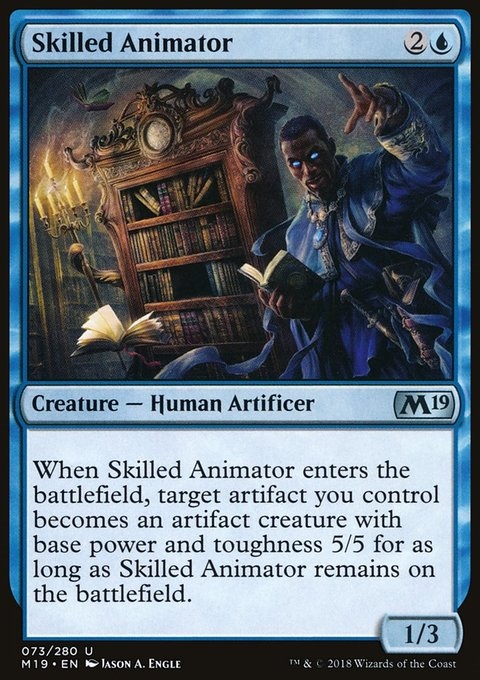 When Skilled Animator enters the battlefield, target artifact you control becomes an artifact creature with base power and toughness 5/5 for as long as Skilled Animator remains on the battlefield.