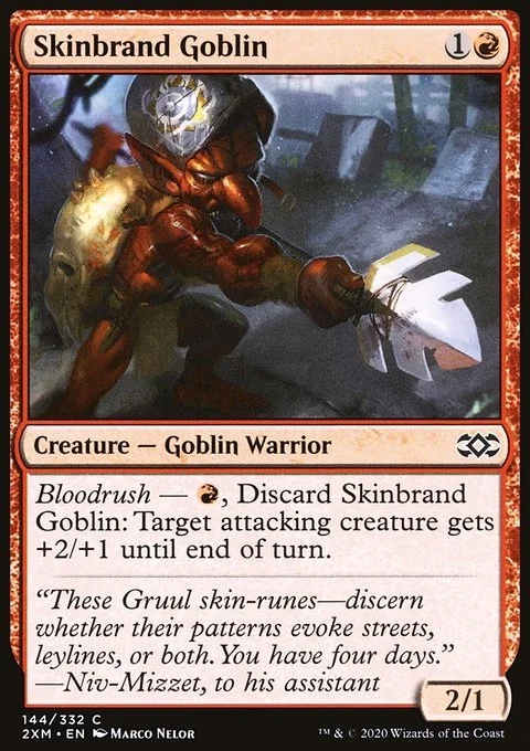 Bloodrush — {R}, Discard Skinbrand Goblin: Target attacking creature gets +2/+1 until end of turn.