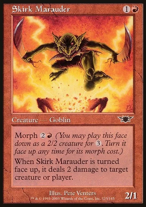 Morph {2}{R} (You may cast this card face down as a 2/2 creature for {3}. Turn it face up any time for its morph cost.) When Skirk Marauder is turned face up, it deals 2 damage to any target.