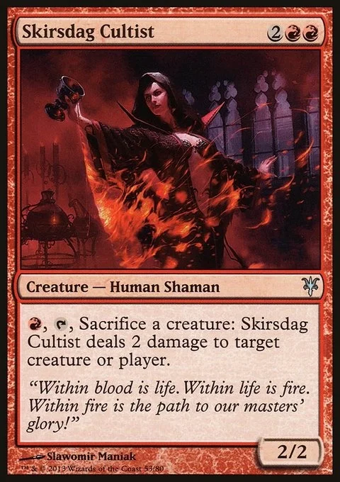 {R}, {T}, Sacrifice a creature: Skirsdag Cultist deals 2 damage to any target.