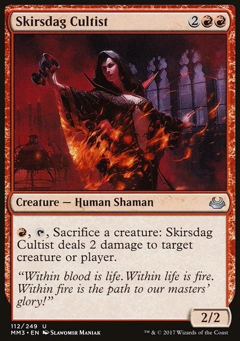 {R}, {T}, Sacrifice a creature: Skirsdag Cultist deals 2 damage to any target.