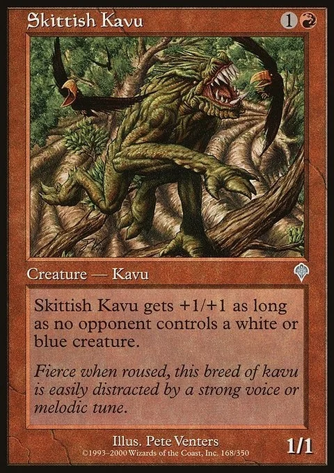 Skittish Kavu gets +1/+1 as long as no opponent controls a white or blue creature.