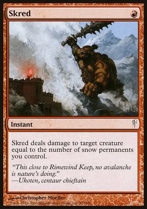 Skred deals damage to target creature equal to the number of snow permanents you control.