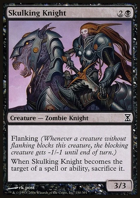 Flanking (Whenever a creature without flanking blocks this creature, the blocking creature gets -1/-1 until end of turn.) When Skulking Knight becomes the target of a spell or ability, sacrifice it.