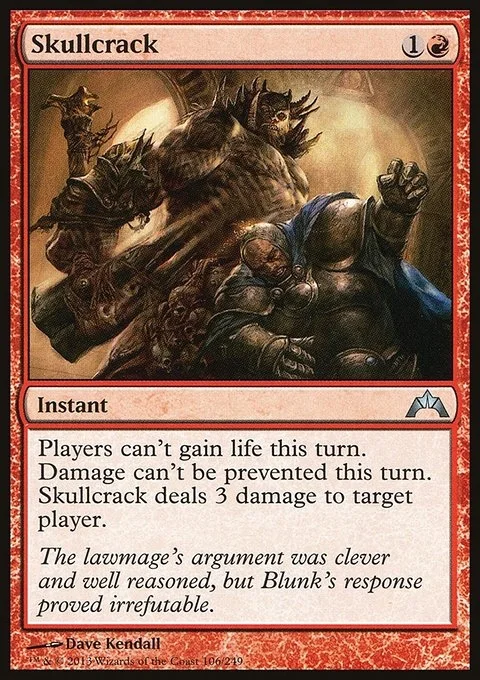 Players can't gain life this turn. Damage can't be prevented this turn. Skullcrack deals 3 damage to target player or planeswalker.