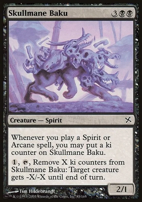 Whenever you cast a Spirit or Arcane spell, you may put a ki counter on Skullmane Baku. {1}, {T}, Remove X ki counters from Skullmane Baku: Target creature gets -X/-X until end of turn.