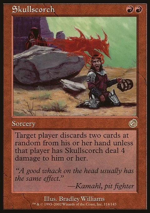 Target player discards two cards at random unless that player has Skullscorch deal 4 damage to them.