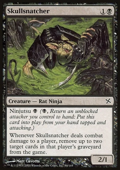 Ninjutsu {B} ({B}, Return an unblocked attacker you control to hand: Put this card onto the battlefield from your hand tapped and attacking.) Whenever Skullsnatcher deals combat damage to a player, exile up to two target cards from that player's graveyard.