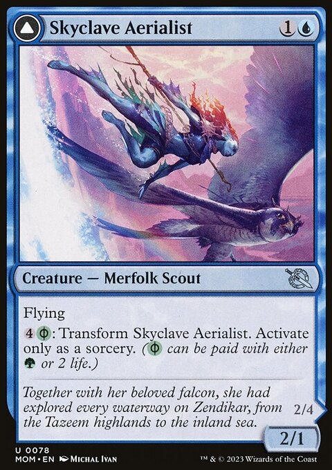 {4}{G/P}: Transform Skyclave Aerialist. Activate only as a sorcery. ({G/P} can be paid with either {G} or 2 life.)