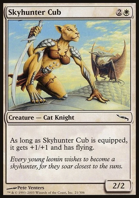 As long as Skyhunter Cub is equipped, it gets +1/+1 and has flying.