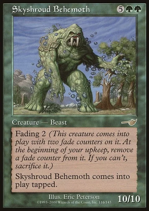 Fading 2 (This creature enters the battlefield with two fade counters on it. At the beginning of your upkeep, remove a fade counter from it. If you can't, sacrifice it.) Skyshroud Behemoth enters the battlefield tapped.