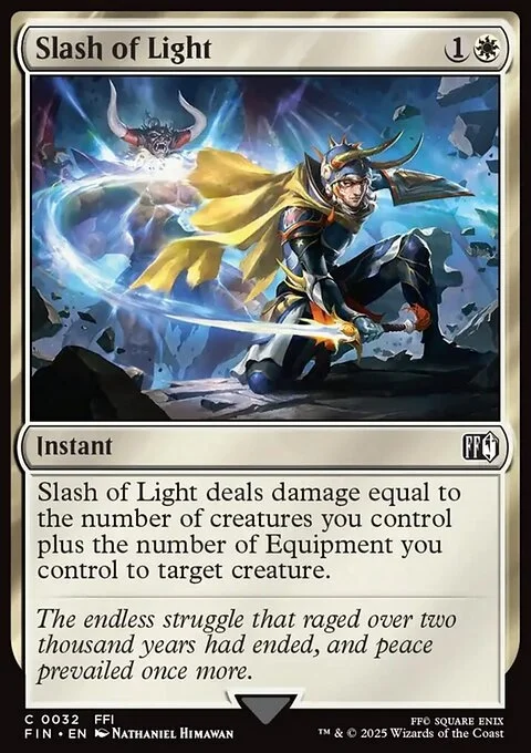 Slash of Light deals damage equal to the number of creatures you control plus the number of Equipment you control to target creature.