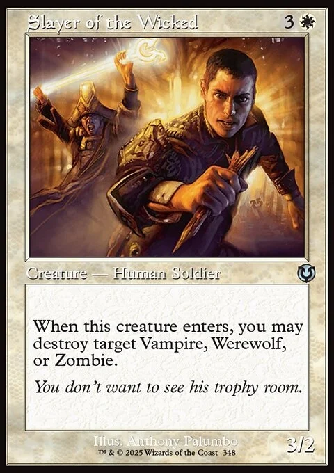 When Slayer of the Wicked enters, you may destroy target Vampire, Werewolf, or Zombie.