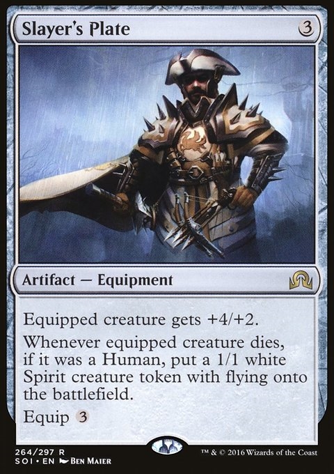 Equipped creature gets +4/+2. Whenever equipped creature dies, if it was a Human, create a 1/1 white Spirit creature token with flying. Equip {3}