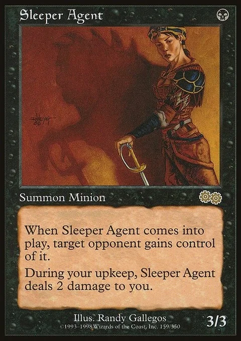When Sleeper Agent comes into play, target opponent gains control of it.During your upkeep, Sleeper Agent deals 2 damage to you.