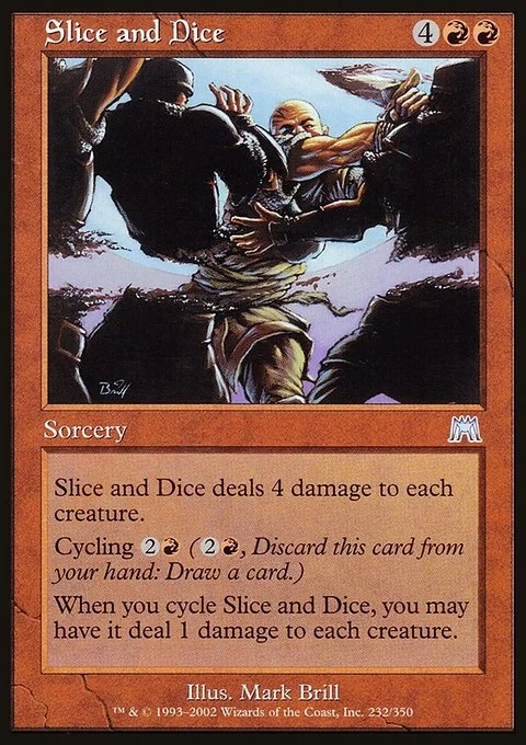 Slice and Dice deals 4 damage to each creature. Cycling {2}{R} ({2}{R}, Discard this card: Draw a card.) When you cycle Slice and Dice, you may have it deal 1 damage to each creature.