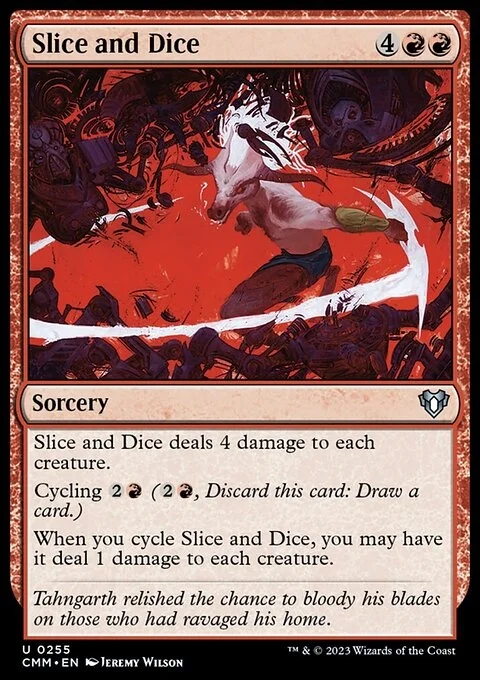 Slice and Dice deals 4 damage to each creature. Cycling {2}{R} ({2}{R}, Discard this card: Draw a card.) When you cycle Slice and Dice, you may have it deal 1 damage to each creature.