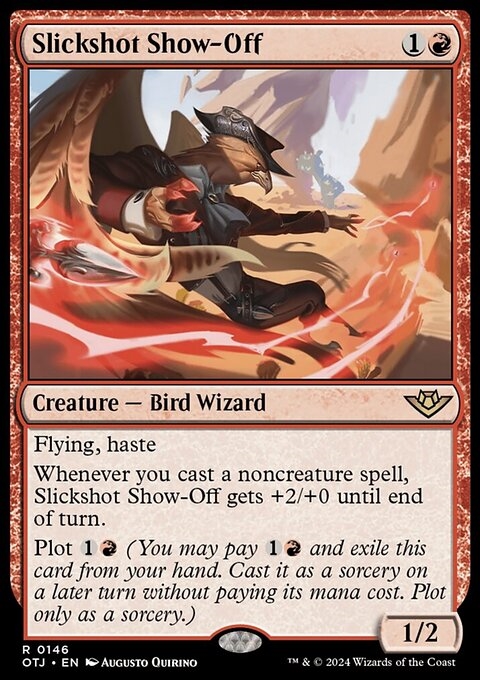 Whenever you cast a noncreature spell, Slickshot Show-Off gets +2/+0 until end of turn.