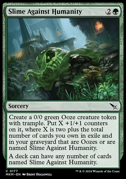 Create a 0/0 green Ooze creature token with trample. Put X +1/+1 counters on it, where X is two plus the total number of cards you own in exile and in your graveyard that are Oozes or are named Slime Against Humanity. A deck can have any number of cards named Slime Against Humanity.