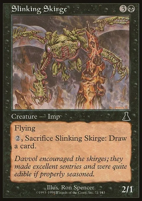 Flying {2}, Sacrifice Slinking Skirge: Draw a card.