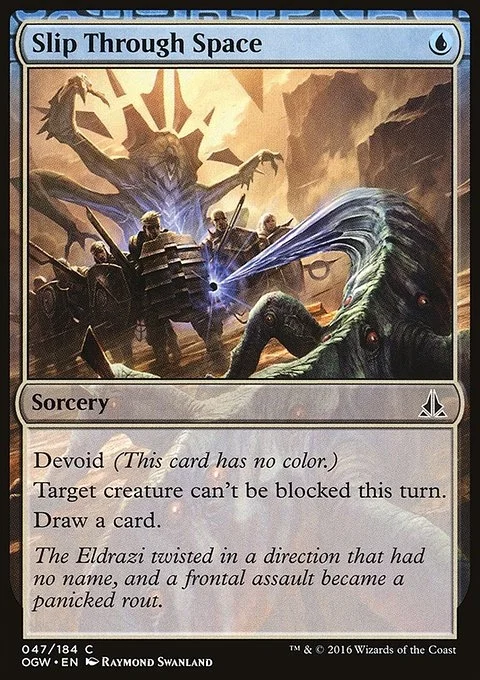 Devoid (This card has no color.) Target creature can't be blocked this turn. Draw a card.
