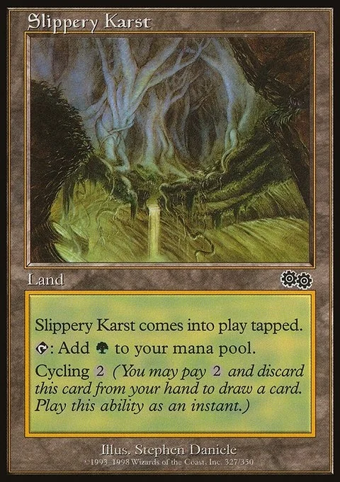 Slippery Karst enters the battlefield tapped. {T}: Add {G}. Cycling {2} ({2}, Discard this card: Draw a card.)
