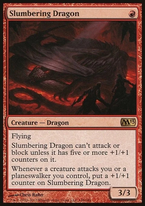 Flying Slumbering Dragon can't attack or block unless it has five or more +1/+1 counters on it. Whenever a creature attacks you or a planeswalker you control, put a +1/+1 counter on Slumbering Dragon.