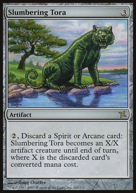 {2}, Discard a Spirit or Arcane card: Slumbering Tora becomes an X/X Cat artifact creature until end of turn, where X is the discarded card's mana value.
