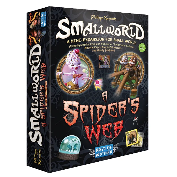 Small World: A Spider's Web is a mini-expansion for Small World that contains three Races (Ice Witches, Skags and Slingmen) and three Special Powers (Copycat, Lava and Soul-Touch). This expansion comes complete with a plastic storage tray designed to store all the badges and tokens from A Spider’s Web, plus it includes room for all the additional recent Small World expansions. It also includes leader tokens for the 3 new Races. A Spider’s Web features entries from Andrew Capel, Alex and Bill Gurski, and Randy Pitchford, “Spiderine” backers from the Small World 2 Kickstarter campaign.