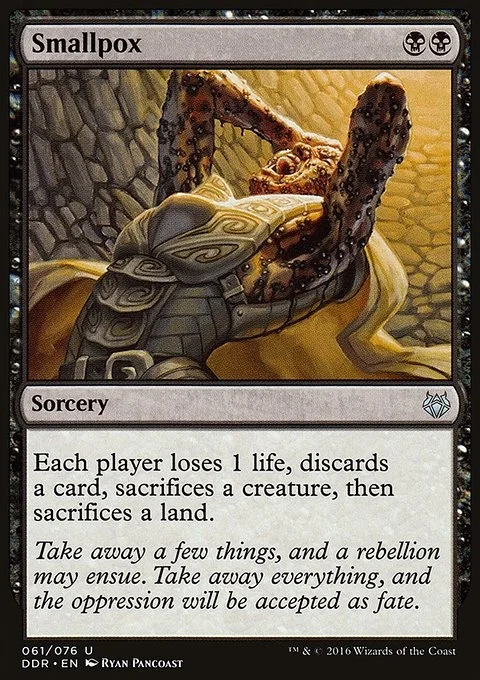 Each player loses 1 life, discards a card, sacrifices a creature, then sacrifices a land.