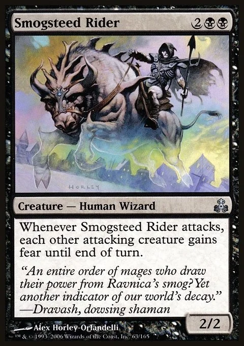 Whenever Smogsteed Rider attacks, each other attacking creature gains fear until end of turn. (They can't be blocked except by artifact creatures and/or black creatures.)