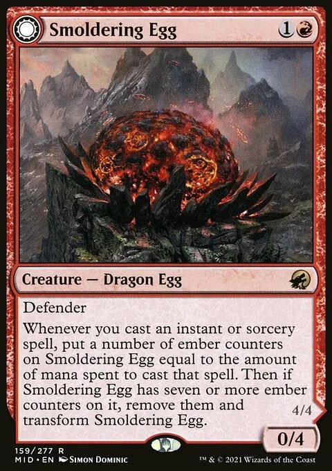 Whenever you cast an instant or sorcery spell, put a number of ember counters on Smoldering Egg equal to the amount of mana spent to cast that spell. Then if Smoldering Egg has seven or more ember counters on it, remove them and transform Smoldering Egg.