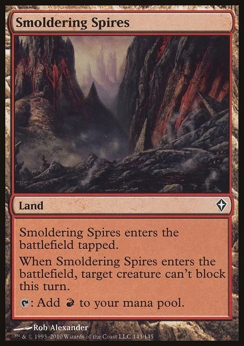 Smoldering Spires enters the battlefield tapped. When Smoldering Spires enters the battlefield, target creature can't block this turn. {T}: Add {R}.