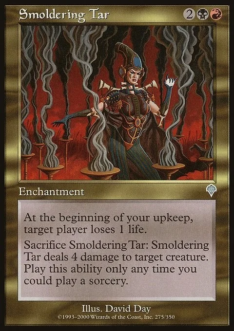 At the beginning of your upkeep, target player loses 1 life. Sacrifice Smoldering Tar: It deals 4 damage to target creature. Activate only as a sorcery.