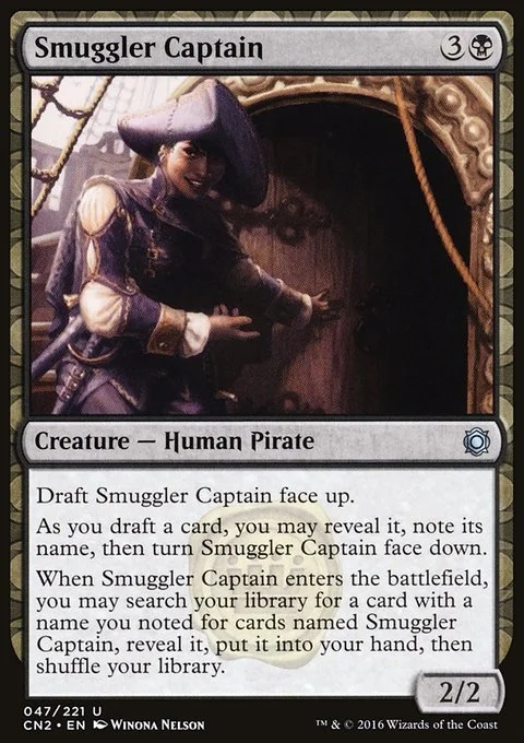 When Smuggler Captain enters the battlefield, you may search your library for a card with a name you noted for cards named Smuggler Captain, reveal it, put it into your hand, then shuffle your library.