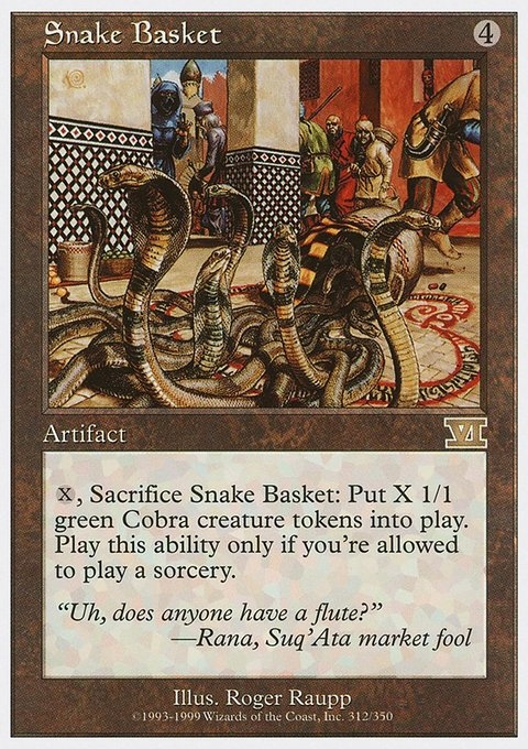 X, Sacrifice Snake Basket: Put X 1/1 green Cobra creature tokens into play. Play this ability only if you’re allowed to play a sorcery.