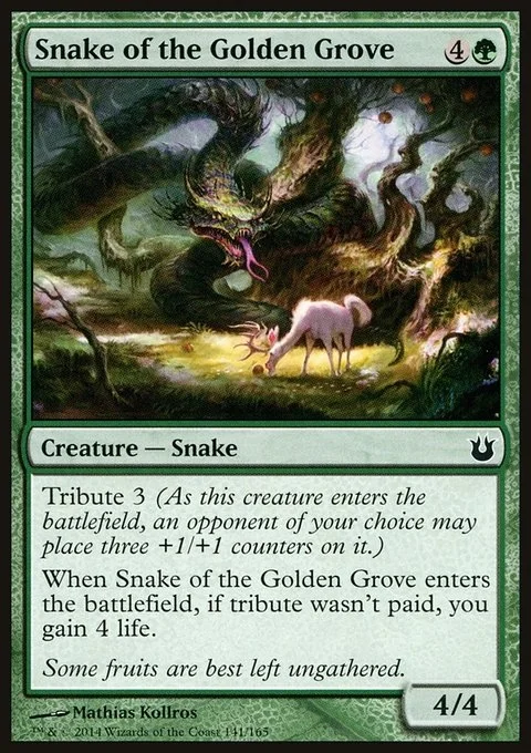 Tribute 3 (As this creature enters the battlefield, an opponent of your choice may put three +1/+1 counters on it.) When Snake of the Golden Grove enters the battlefield, if tribute wasn't paid, you gain 4 life.