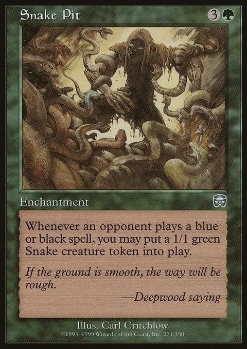 Whenever an opponent casts a blue or black spell, you may create a 1/1 green Snake creature token.