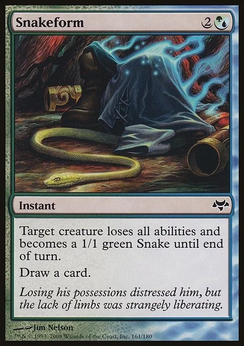 Until end of turn, target creature loses all abilities and becomes a green Snake with base power and toughness 1/1. Draw a card.
