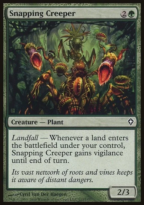 Landfall — Whenever a land enters the battlefield under your control, Snapping Creeper gains vigilance until end of turn.