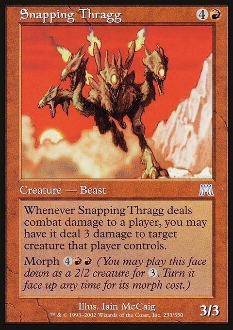 Whenever Snapping Thragg deals combat damage to a player, you may have it deal 3 damage to target creature that player controls. Morph {4}{R}{R} (You may cast this card face down as a 2/2 creature for {3}. Turn it face up any time for its morph cost.)