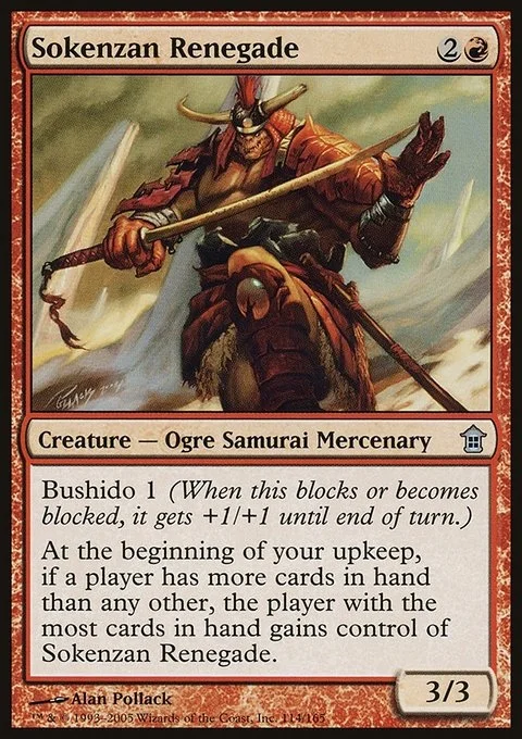 At the beginning of your upkeep, if a player has more cards in hand than each other player, the player who has the most cards in hand gains control of Sokenzan Renegade.