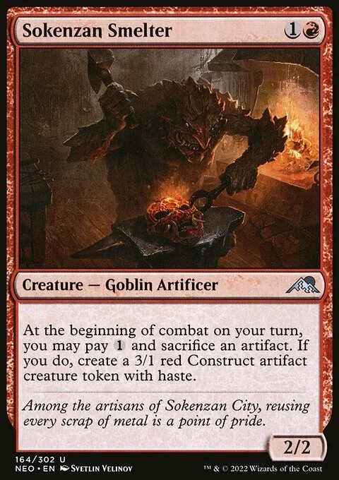 At the beginning of combat on your turn, you may pay {1} and sacrifice an artifact. If you do, create a 3/1 red Construct artifact creature token with haste.