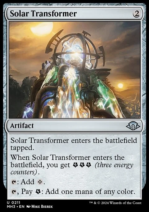 Solar Transformer enters the battlefield tapped. When Solar Transformer enters the battlefield, you get {E}{E}{E} (three energy counters). {T}: Add {C}. {T}, Pay {E}: Add one mana of any color.